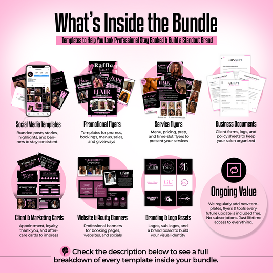 That’s where this 360+ template bundle comes in — giving you everything you need to show up like a six-figure pro, attract dream clients, and streamline your salon or freelance setup from day one.