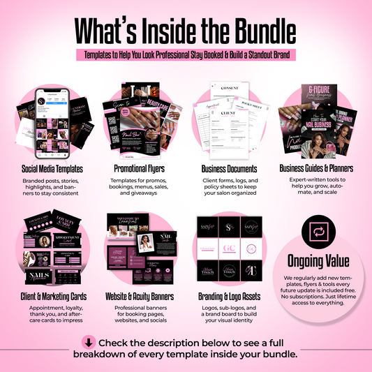 You’re getting 360+ templates, business tools, and branding assets — all for less than the price of a single client booking.No subscriptions. No hidden fees. Just everything you need to elevate your nail business — and look like the pro you are.