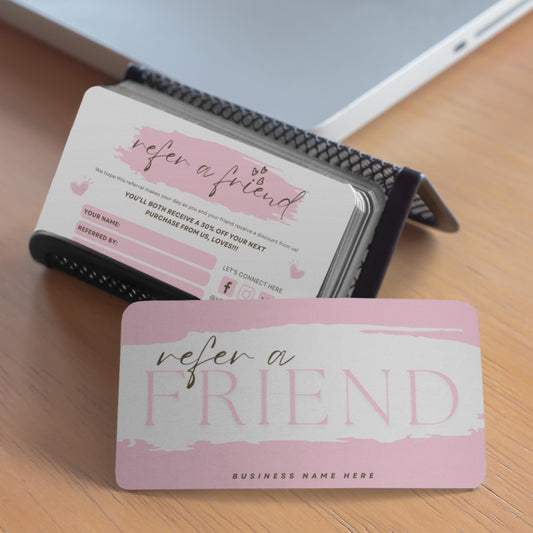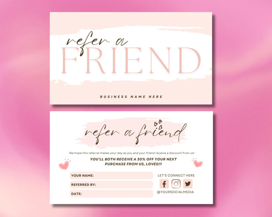 referral card template, refer a friend card, editable Canva referral, small business referral program, printable discount card, pink referral card design, customer reward card, salon spa referral template, boutique marketing cardSale -