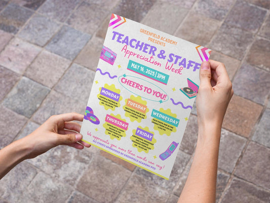 Regular price $2.99Regular priceUnit price / per$5.00Sale price $2.99Save MONEY💸, TIME⌛, and EFFORT💪 with our vibrant Teacher & Staff Appreciation Week Flyer Template! Designed with a fun, retro vibe and bold, colorful elements, this editable Canva flyer is the perfect way to celebrate educators and staff in style.