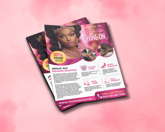 Designed for salon owners, estheticians, and beauty professionals, this elegant two-sided layout highlights your top treatments—from facials and massages to glam makeup and microblading. Professionally crafted with modern visuals and pricing options, it's perfect for showcasing your full service menu and contact details. Whether you're launching a new beauty brand or refreshing your marketing materials, this flyer will leave a lasting impression. Just customize, print, and watch your bookings glow!--------- ✨HOW IT WORKS✨ ---------