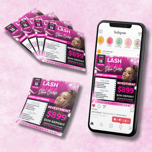 Regular price $2.99Regular priceUnit price / per$5.98Sale price $2.99Promote your lash training, lash class, or lash course with this editable Lash Babe Deluxe Course Flyer template. Designed for lash artists, beauty professionals, and educators, this luxury flyer includes bold colors, modern layouts, and editable Canva elements so you can customize it to fit your training event. Perfect for advertising lash courses, deluxe lash classes, and beauty training events.