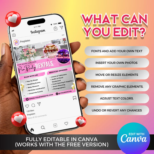 Regular price $2.99Regular priceUnit price / per$5.98Sale price $2.99Party Rentals Flyer Template designed for event planners, rental businesses, and party decor professionals 🎉 Perfect for promoting your services, event equipment, and party packages on Instagram, Facebook, or print. This editable Canva template features a modern pink layout, elegant fonts, and organized sections to highlight your services, contact info, and social links — helping you attract more bookings and elevate your event brand effortlessly.