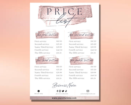 Price List, DIY Flyer Template Design, Rose Gold Price Sheet, Hair Pricing Flyer, Pricelist Flyer, Pricing Guide Sheet, Premade Salon Flyer