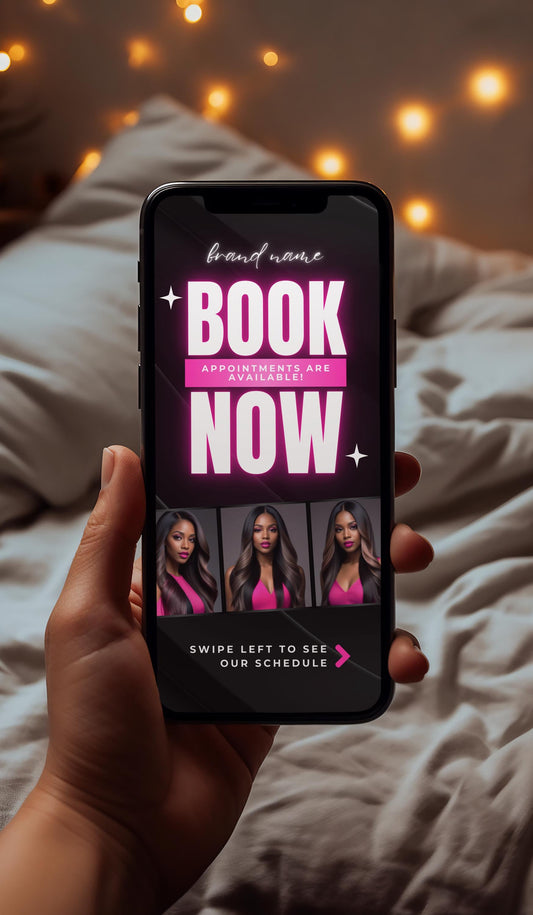 Regular price $2.99Regular priceUnit price / per$6.95Sale price $2.99Save MONEY💸, TIME⌛, and EFFORT💪 Capture your client's attention with our Animated Beauty Bookings template! This vibrant, fully editable design is perfect for showcasing your salon’s available appointments in an engaging, easy-to-navigate layout. With customizable text, music options, and a sleek, modern aesthetic, this template is ideal for beauty professionals aiming to boost bookings. Highlight your schedule, share in all apps, and let clients book effortlessly. Perfect for stylists, salon owners, and beauty businesses, this template makes managing appointments stylish and straightforward. Keep your calendar full and your clients coming back with this eye-catching animated booking solution!