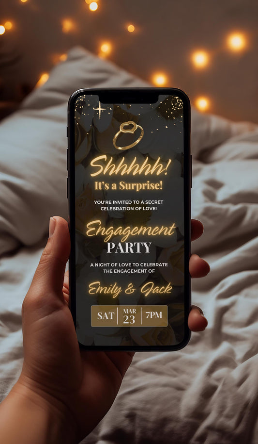 Regular price $2.99Regular priceUnit price / per$5.95Sale price $2.99Save MONEY 💸, TIME ⏳, and EFFORT 💪 with our stunning Animated Engagement Party Video Invite Template! Perfect for celebrating love in style, this fully customizable video invite features elegant animations, sparkling gold accents, and editable text to make your event unforgettable. Easily upload your favorite song and share across all platforms to delight your guests with a personal touch. Ideal for surprise parties or grand celebrations, this modern and sophisticated template sets the tone for a magical engagement night. Elevate your invitation game and create memories that last forever! 💍✨