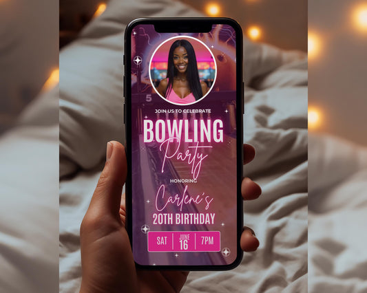 Customize with your event details, upload any song, and share instantly across all apps! Featuring vibrant colors, sleek animations, and easy-to-read details, this invitation will have everyone lacing their bowling shoes and gearing up for an unforgettable time.