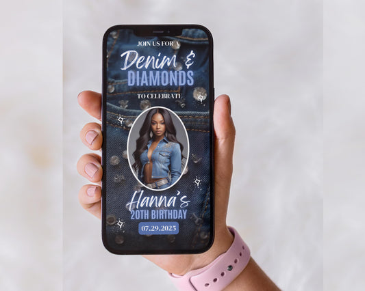 Denim and Diamonds Birthday Video Invitation, DIY Template Design, Animated Blue Jean and Diamonds Event Invite, Premade Elegant Denim ThemeSale -