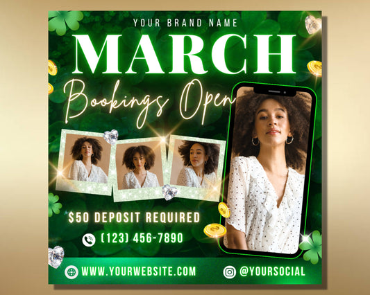 March Booking Flyer, DIY Flyer Template Design, Appointment Flyer, Book Now Flyer, St. Patrick's Flyer, Hair Flyer, Premade Editable FlyerSale -
