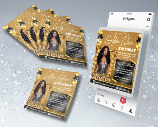 Birthday Party Flyer, DIY Flyer Template Design, Birthday Girl Party Invites Flyer, Gold Birthday Night Party Event Flyer, Celebration Flyer