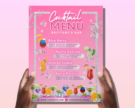 Regular price $2.99Regular priceUnit price / per$5.00Sale price $2.99Save, MONEY💸, TIME⌛ and EFFORT💪 with this Cocktail Menu Flyer template! EDIT YOUR FLYER on CANVA on your PC or mobile device. Canva is a FREE web-based design platform that is super simple, easy to use, and FUN!