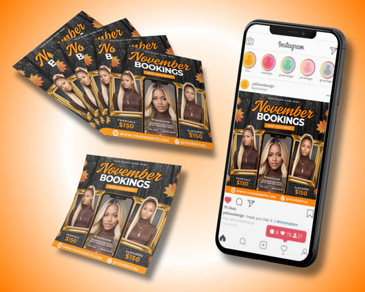 Regular price $2.99Regular priceUnit price / per$5.00Sale price $2.99Save MONEY💸, TIME⌛ and EFFORT💪 Get ready to fill your calendar with our stunning November Bookings Beauty Flyer template! Perfectly designed for hairstylists, salons, and beauty professionals, this eye-catching flyer showcases your latest services, from frontal and closure installations to personalized beauty experiences. With bold autumn accents and a modern mobile booking display, this template invites clients to secure their spot effortlessly. Promote your brand, highlight seasonal offers, and ensure your clients book early to enjoy flawless results. Elevate your business’s visibility this November and keep your appointment book full.