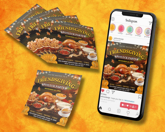 Regular price $2.99Regular priceUnit price / per$5.00Sale price $2.99Save MONEY💸, TIME⌛, and EFFORT💪 Invite your friends in style with this vibrant Friendsgiving Potluck Party Flyer template! Perfect for bringing loved ones together, this cozy and festive design features warm autumn colors and mouthwatering food visuals that set the mood for a fun night. Whether you're hosting a casual get-together or a lively celebration, this flyer makes it easy to promote your event and get everyone excited. With customizable details for date, location, and RSVP, this professionally crafted template ensures your gathering will be one to remember. Celebrate the season with great vibes, good food, and even better company!