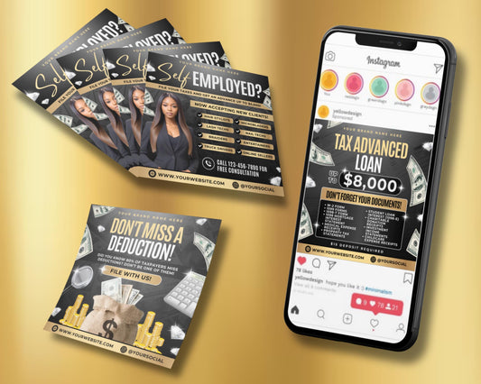 Regular price $2.99Regular priceUnit price / per$6.95Sale price $2.99Save, MONEY💸, TIME⌛, and EFFORT💪 BOOST your TAX business with our eye-catching Tax Preparation Flyer Bundle! This professionally designed set is perfect for promoting tax services to self-employed individuals, freelancers, and small business owners. Highlight your offerings, from tax advance loans to ensuring no deductions are missed. Ideal for tax professionals looking to attract new clients, this bundle provides a sleek, modern look that builds trust and credibility. With customizable elements, this template lets you present your services with ease and professionalism, helping you connect with clients during tax season and beyond.