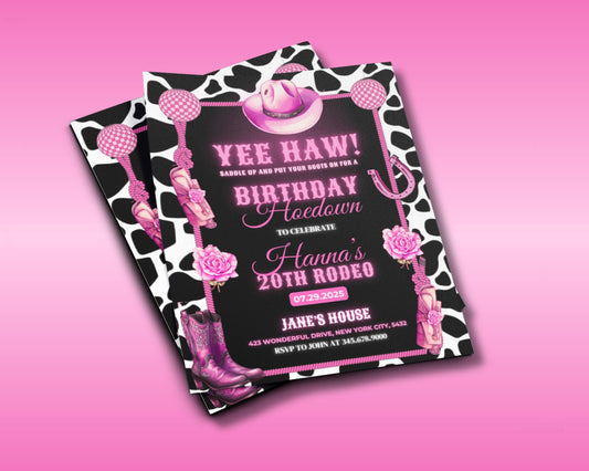 Customize effortlessly with your event name, date, time, location, and RSVP details. Featuring iconic pink cowboy hats and boots, charming roses, a bold cow print background, and a touch of sparkle, this invitation perfectly blends rustic charm with modern glam. Easily print at home or send digitally via text or email!❤️INSTANT ACCESS to your Flyer after purchase, so no time is wasted!