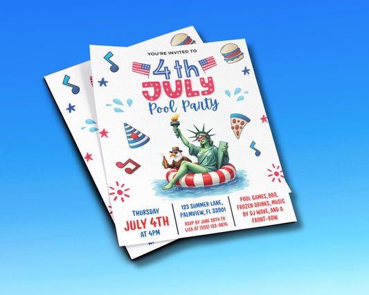 Customize with your event details, location, RSVP information, and all the fun activities like pool games, BBQ, and frozen drinks! Featuring a fun Lady Liberty on a pool float, festive flags, and playful summer icons, this invitation captures the spirit of Independence Day. Easily print at home or send digitally via text or email!