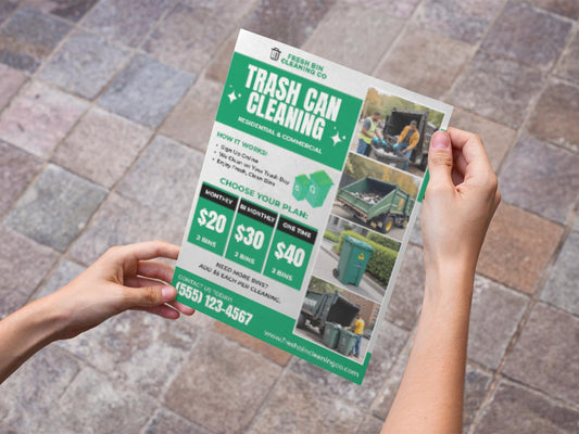 Regular price $2.99Regular priceUnit price / per$5.98Sale price $2.99Save MONEY💸, TIME⌛, and EFFORT💪 with our essential "Trash Can Cleaning" Services Flyer template. Perfect for residential and commercial cleaning businesses, this practical and informative design clearly outlines your bin cleaning plans. Ideal for trash can cleaning companies, pressure washing services, or property management businesses, this flyer is designed to attract new clients and emphasize the benefits of fresh, clean bins. Whether you're offering regular maintenance or a single deep clean, this professionally crafted template will help your sanitation services stand out. Elevate your cleaning business and ensure your customers enjoy a truly fresh bin experience!