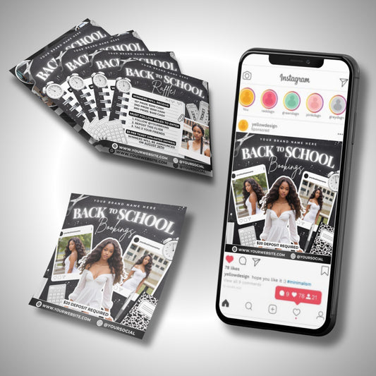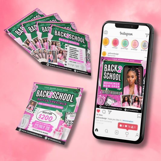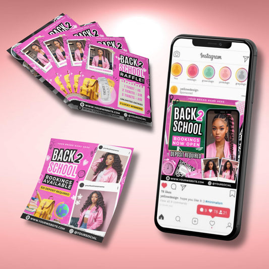 Regular price $3.99Regular priceUnit price / per$7.98Sale price $3.99Save MONEY💸, TIME⌛, and EFFORT💪 with our vibrant "Back to School" Hair & Beauty Flyer Set. Perfect for hair stylists, braiders, and beauty businesses, this comprehensive set of four editable templates is designed to announce bookings, showcase exciting specials on popular styles like frontals and closures, promote flash sales with discounts, and generate buzz with raffles. Ideal for attracting students and parents gearing up for the school year, these pink and black themed flyers are designed to capture attention and drive appointments. Whether offering discounts, hosting giveaways, or simply boosting your brand, this professionally crafted template set will make your back-to-school promotions shine. Elevate your beauty business and ensure students start the year with fresh, stylish looks!