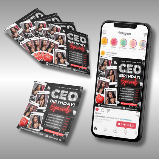 Regular price $2.99Regular priceUnit price / per$5.98Sale price $2.99Save MONEY💸, TIME⌛, and EFFORT💪 with our exclusive "CEO Birthday Specials" Hair Extension Flyer template. Perfect for hair businesses, stylists, and wig vendors, this glamorous black and diamond-themed design highlights special pricing for various hair lengths and waves. Ideal for celebrating your brand's milestone or offering special promotions, this flyer is designed to attract discerning clients looking for premium hair investments. Whether you're a luxury hair brand or a growing beauty enterprise, this professionally crafted template will make your birthday specials shine. Elevate your hair business and ensure your clients feel like true CEOs with their stunning new looks!