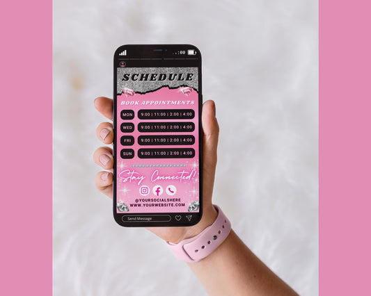 Regular price $3.99Regular priceUnit price / per$8.50Sale price $3.99Save MONEY💸, TIME⌛, and EFFORT💪 with our stylish Instagram Stories template, perfect for highlighting available appointment slots. Featuring a chic black and pink design, this template is ideal for salon owners and beauty professionals looking to attract new clients and keep their schedules full. Whether promoting last-minute openings or showcasing your stunning services, this professionally crafted template ensures your salon stands out on social media. Elevate your brand and make booking appointments a breeze!